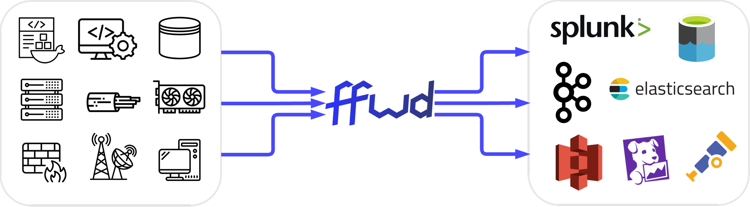 FFWD Pipeline sits at the aggregation point — collecting from all sources in any format, then routing to any combination of destinations: Splunk, Datadog, Elasticsearch, Kafka, S3, cloud storage, your data lake — whatever you need, now or in the future.